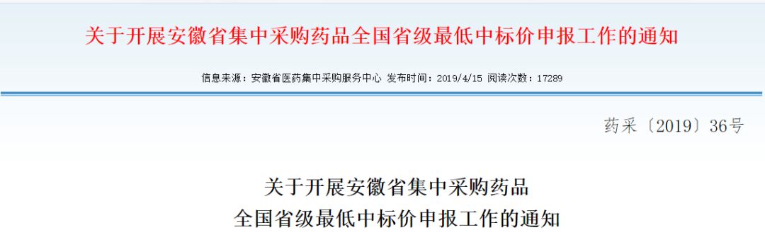 不僅是廣西,同日(4月15日),安徽省醫(yī)藥集中采購平臺發(fā)布通知稱,為完善安徽省藥品集中采購系統(tǒng)數(shù)據(jù)庫、規(guī)范藥品集中采購工作,經(jīng)報省醫(yī)保局同意,現(xiàn)開展我省集中采購藥品全國省級最低中標(biāo)價的申報工作。